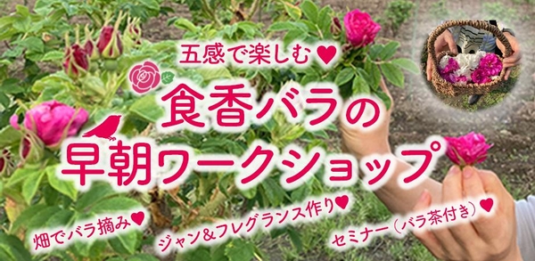 昨年初開催で好評を得た、食香バラの朝摘み体験会。今年は食香バラの魅力をさらに五感で感じていただけるよう、朝摘み体験会にワークショップをプラスし、バージョンアップした内容で実施いたします。香り高い食香バラを味わいつくす、バラの朝食会付き贅沢フルコースもご用意いたしました。