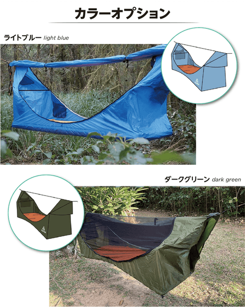 蚊帳、防水加工、換気性があるだけでなく、木がない場所でも設置できるようにペグとロープも付属。ハンモックとテントのいいとこ取りを実現しました。
