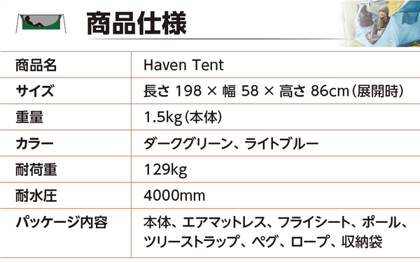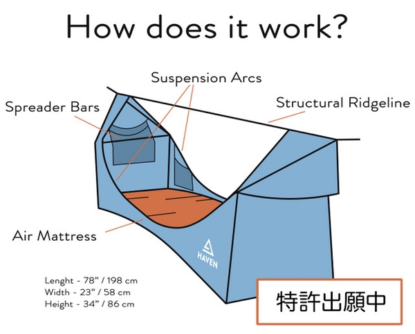 Haven Tent (ヘブンテント)は腰に負担がかからず、体に優しい、世界初のフルフラット式ハンモックです。
