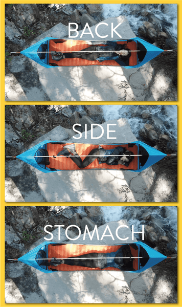 従来のハンモックのように腰が沈まないので、仰向け、横向き、うつ伏せなどお好きな姿勢で寝ることができます。また、フライシート付きなのでソロキャンプ用テントとしても活躍します!