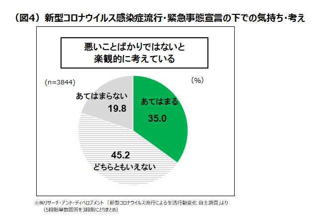 緊急事態宣言下でも「悪いことばかりではない」と考える人は35%。自由回答には、「危機を乗り越えた先に日本の改革が進む」「今までと違う形の“普通の生活”をしなくては」など、この事態をきっかけに、以前に戻るのではなく、新しい生活を作っていくべきとの意見が挙げられている。