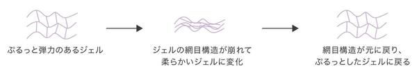 ぷるっと弾力のあるジェルは、力を加えると網目構造が崩れて柔らかいジェルに変化するのに、しばらくすると網目構造が元に戻り、ぷるっとした感触に戻ります。