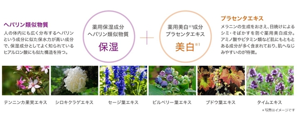 角質層のすみずみまで潤いを届ける薬用保湿成分「ヘパリン類似物質」と美白※1を叶える薬用美白※1成分「プラセンタエキス」のWの薬用有効成分をはじめ、保湿成分「テンニンカ果実エキス」「シロキクラゲエキス」など、自然由来の保湿成分を6種配合。乾燥肌を潤いで満たす薬用ジェルです。