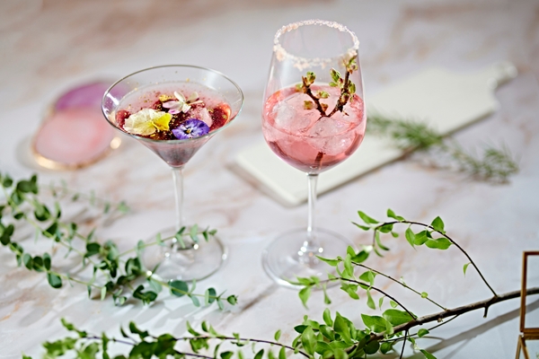 白ワインをベースに、桜のリキュールを加えた香り豊かなカクテル。アクセントに桜の生枝を挿し、見た目も華やかに仕上げました。