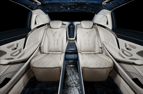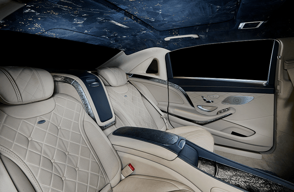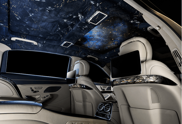 威厳あるスリーポインテッドスターを散りばめ西陣織で彩るルーフライニング。前方のサンルーフを開けると、箔で表現した時空を歪めるプラズマの如く魅惑的な宇宙の姿が現れます。 ゲストを囲むインテリアパネルは引箔模様を施し、シートバックのトリムには引箔の上に漆芸による高蒔絵を施しました。繊細で力強い表現は見るものを魅了します。 センターコンソール部分には、レザーをテキスタイルとして織込んだ贅沢な素材を起用しています。 フロアマットは毛足が長く踏み心地の気持ちいいシャギーマット。