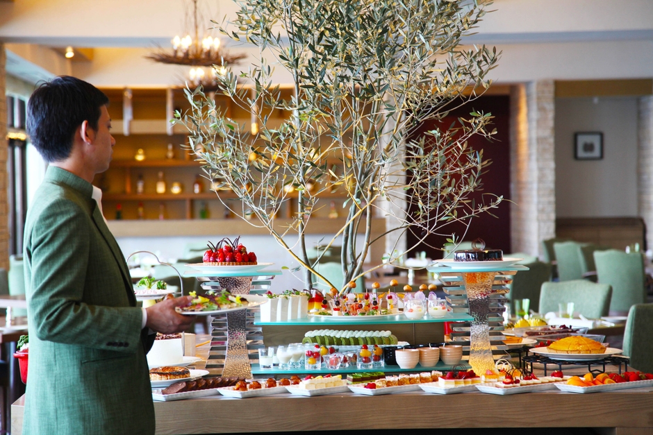 落ち着いた石畳みとアンティーク風ガラスを用いた光壁に彩られたエントランスが皆様をお迎えします。フランスの古城をコンセプトにした石造りの壁面やシャンデリアがエレガントな雰囲気。地中海の果実や輝く太陽を思わせるインテリア、ワインルージュとオリーブグリーンの絨毯、四季を表現した爽やかな食空間が広がります。