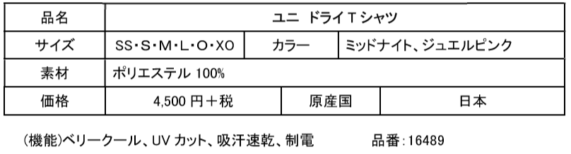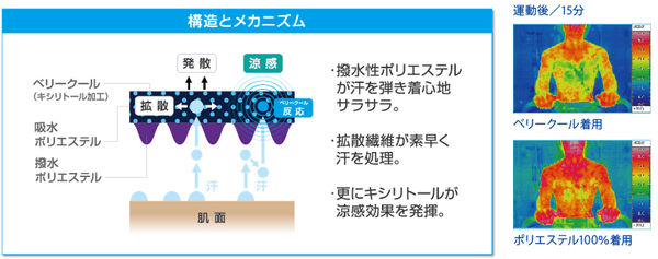 ウェア内を3℃低く保つ「ベリークール」と肌面をドライにする機能を併せ持つ新素材です。生地に配合したキシリトールが汗に反応して熱を吸収。また、汗を素早く吸収・拡散させて乾燥を促進させる生地構造を採用しています。クーリング効果と汗のベタつきのストレスを軽減させることで選手のパフォーマンスを向上させます。