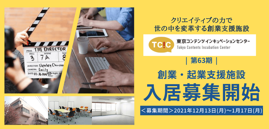 コンテンツ分野に特化した東京都の創業支援施設 「東京コンテンツインキュベーションセンター(TCIC)」が 、12月13日(月)より第63期入居募集を開始。