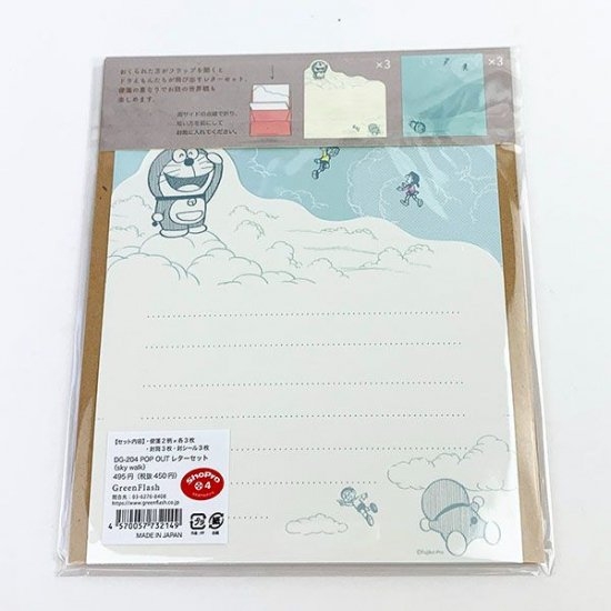 可愛らしいピンクの封筒には、雲の上で楽しそうな3人の便箋がセットになっています。