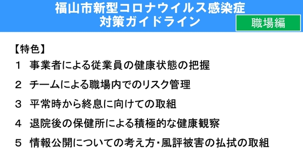 広島県福山市では,新型コロナウイルス感染症対策ガイドライン「家庭編」,「職場編」の2つを策定しました。