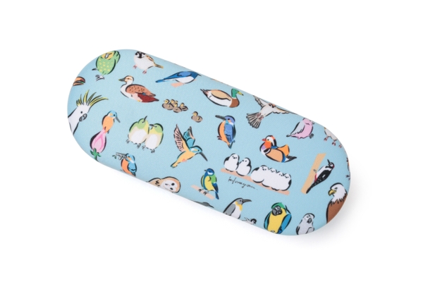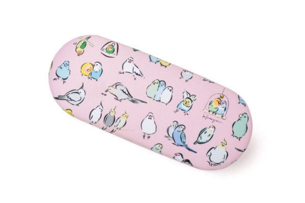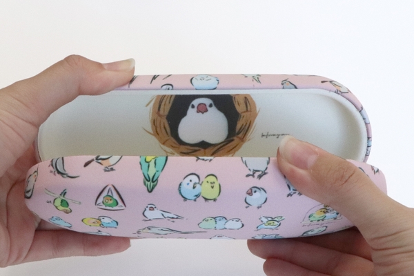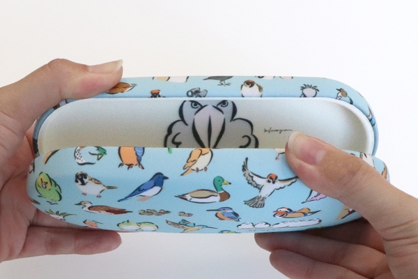 メガネケースの中にはモッチリくつろぐ文鳥と、こちらをじっと見つめるハシビロコウが顔を覗かせメガネフレームを衝撃から守ります。