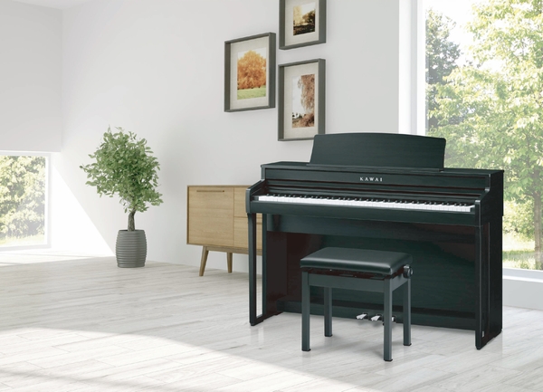 鍵盤にはカワイのCAシリーズではお馴染みとなる、シーソー式構造を備えた木製鍵盤『グランド・フィール・スタンダード・アクション』を搭載。「鍵盤を押すことでハンマーが上がり、ハンマーが弦を叩く」というグランドピアノの基本的な発音機構を採用したことで自然なタッチを実現しました。またグランドピアノ同様、弱打の際は全ての鍵盤の手ごたえは一定、強打の際は低音は手ごたえが大きく、高音は小さいという鍵盤の特性も再現しています。音色の面では音響機器メーカーとして名高いオンキヨー株式会社との共同開発による新電気回路を搭載したことで、グランドピアノに忠実な音色再現が可能に。合計4つのスピーカーを搭載し、綺麗に澄み渡る高音スピーカーと豊かに響き渡る中低音スピーカーがこの音色再現を支えます。