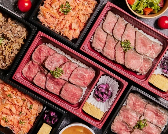 ローストビーフや牛しぐれ、鮭などの人気食材を折箱に詰めました