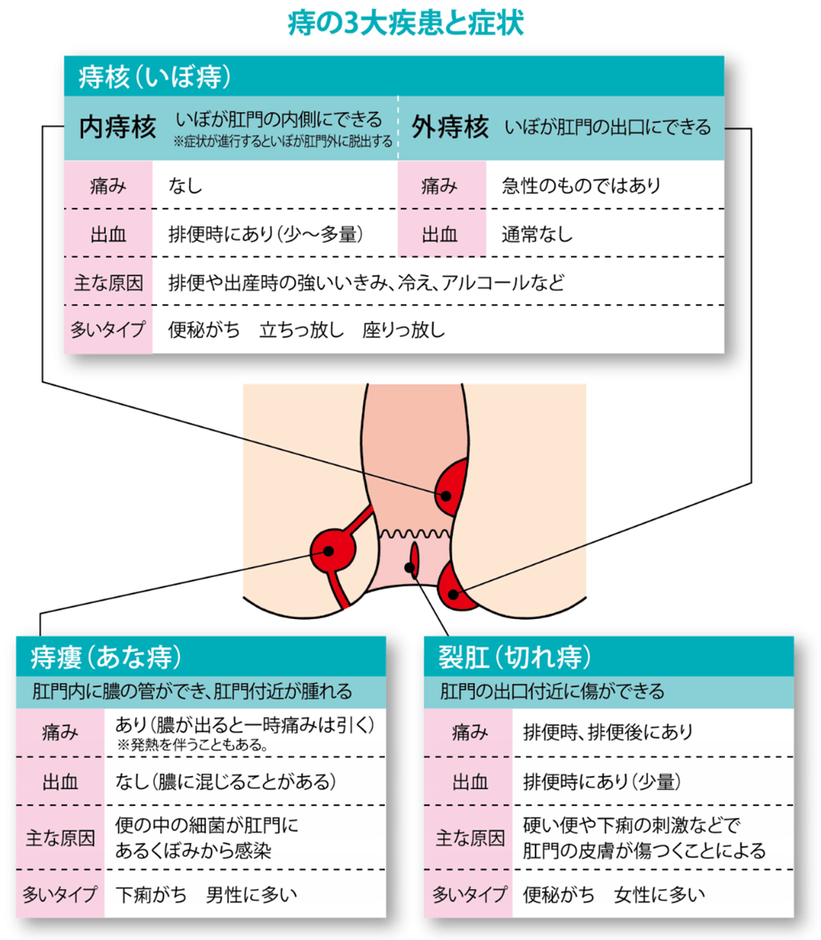 痔とは、肛門とその周辺の病気の総称。「痔(じ)核(かく)(いぼ痔)」と「裂(れっ)肛(こう)(切れ痔)」「痔(じ)瘻(ろう)(あな痔)」を痔の3大疾患といい、タイプによって、症状や対策は異なります。男性に多いと思われがちな痔ですが、実は男女問わず、誰でもかかる可能性のある身近な病気なのです。