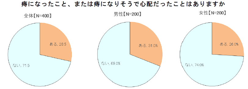 ◆男性の約3割(31.0%)、女性の4人に1人(26.0%)が「痔になった」または「なりそうで心配だった」と回答