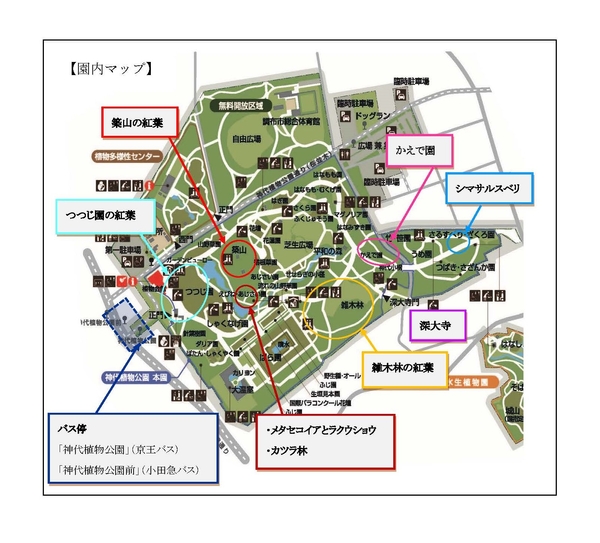 このほか、園内では、イチョウやユリノキ、モミジバフウなどが鮮やかに色づきます。また、かえで園には和の風情豊かなフォトスポットを設置します。思い出作りに一枚いかがでしょうか。さらに、紅葉の見頃に合わせ、園内の「紅葉ガイド」も実施します。日程などの詳細は当園公式ホームページでお知らせいたします。