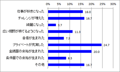 全体では「プライベートで充実した」24.7%が1 位、続いて「金銭面の余裕が生まれた」20.0%が2 位となりました。しかし30 代は「プライベートで充実した」が16.0%と少なく、「金銭面での余裕が生まれた」21.0%が1 位。「仕事が好きになった」では20 代が21.0%と多めで、40 代は12.0%と低い結果になりました。