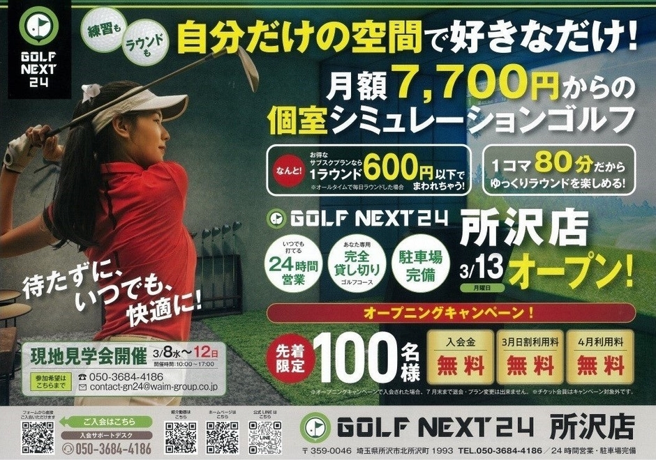 不動産の所有、売買、管理などを行うワイム総合企画株式会社(東京都新宿区、代表取締役 佐藤 直史)は、昨年12月にオープンし,3ヶ月で400名の会員を獲得し大盛況を博している地域密着型の個室シミュレーションゴルフ施設【GOLF NEXT 24】相模原・橋本店に続き、3月13日に埼玉県所沢市に全10室2階建て仕様の大型店舗をオープン。