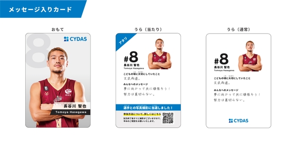 会場にいらっしゃるお子様には、越谷アルファーズのメンバーからのメッセージカード付きのお菓子の詰め合わせBoxをプレゼントいたします。コドモ心をくすぐるトレーディングカード風のデザインのカードの裏面には、各メンバーの「コドモの頃に大切にしていたこと」と「みんなへのメッセージ」が。