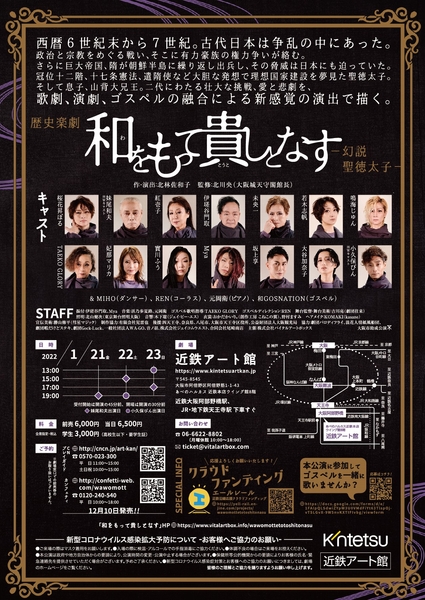 株式会社バイタルアートボックス主催 歴史楽劇「和をもって貴しとなす-幻説 聖徳太子-」が2022年1月21日(金)~1月23日(日)に近鉄アート館(大阪府大阪市)にて上演されます。チケットはカンフェティ(運営:ロングランプランニング株式会社、東京都新宿区、代表取締役:榑松 ⼤剛)にて12月10日(金)より発売開始予定です。