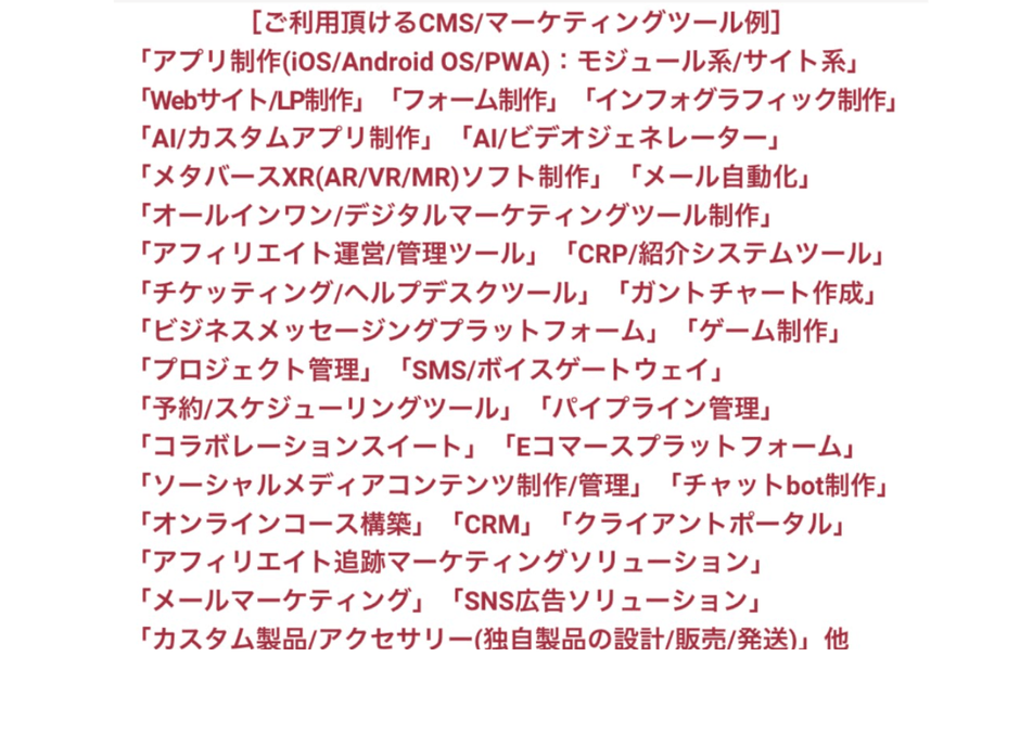 CMS世界最高峰「Bubble」をはじめ、世界中の人気ノーコードツールを1,000種類以上から厳選して、自由に選んで制作・運用・転売が可能!タイトルをリクエストして無料で追加利用も可!