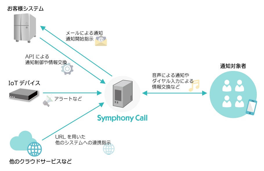 「Symphony Call」は、自動音声による電話通知に特化した通知サービスです。今回リリースしたリニューアル版では、これまでの順次通知や輪番対応通知機能などはそのままに、通話中にダイアル操作などをやり取りしながら、様々な制御を行う通知アクション機能を実装しました。これにより単なる電話通知だけでなく、通話中の相手の指示によりIoT機器をはじめとする様々なシステムとの連携を行ったり、データの収集を支援する基盤システムとして活用いただけるようになりました。