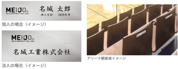 「名城大学開学100 周年記念アリーナ椅子銘板募金」は、観客席の背板に寄付者の芳名を刻む特別企画で、3 月11 日から募集を開始。募集座席数は482 席で、個人だけでなく、法人や団体、有志の会でも応募できます。
