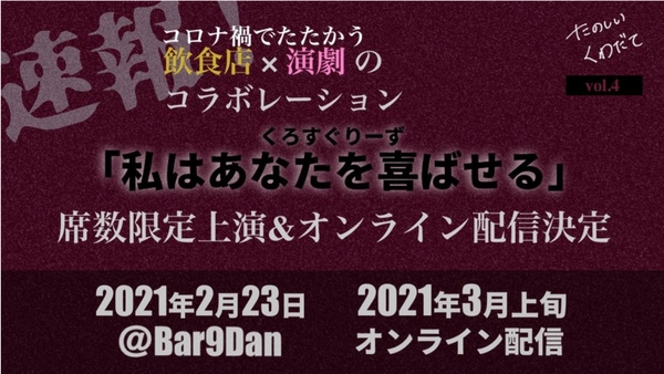 「脳内の楽しい企てを三次元化する」をモットーに活動する企画団体「たのしいくわだて(主宰:嶋尾明奈)」は、2021年2月に「Bar 9Dan」とコラボレーションし、特別公演を開催します。