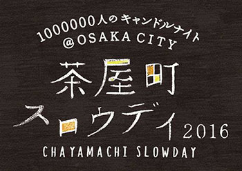 「1000000人のキャンドルナイト@OSAKA CITY 茶屋町スロウデイ2016」ロゴ本イベントは、年に一度の夏の日に茶屋町エリアの企業、地域団体及び行政が集い、新たに取り組む活動です。本実行委員会では、この活動がエリアがもつ魅力への気付きと新たな交流のきっかけとなることを目指して取り組んでまいります。