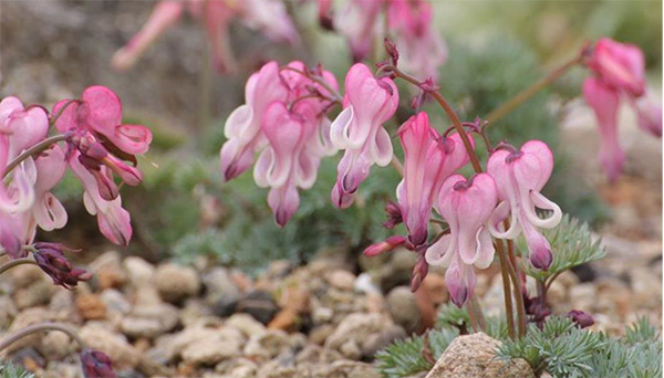 コマクサ(ケシ科)当園のシンボルマークにもなっている「コマクサ」は、高山植物の女王と称される象徴的な花です。今年は暖かい気温が続いたため、例年よりも1週間早く開花しました。神秘的な瑠璃色の葉と、あでやかな桃色の花との調和が素晴らしく、高山帯に行かなければなかなか見ることのできない貴重な花です。園内では、高山帯を模したロックガーデンで約150株のコマクサを植栽しています。