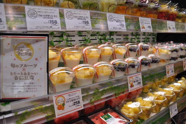 パイナップルや季節の果物が入ったカットフルーツはサイズも豊富に展開いたします。店内でフルーツを盛りつける「フルーツ杏仁豆腐」や「フルーツジュレ」はデザートにおすすめです。
