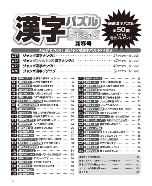 パズルは全部で50問。「漢字ナンクロ」「漢字スケルトン」「漢字つめクロス」「漢字ジグザグ」など、いずれも”解く楽しみ”を重視して、むずかしすぎない問題レベルに設定しました。本誌センター折り込みの「超ジャンボ漢字パズル」は、広げると左右76㎝になる両観音仕様で、チャレンジのしごたえ十分。「ジャンボ漢字ナンクロ」は賞金3万円、「ジャンボスケルトン風漢字ナンクロ」「ジャンボ漢字ジグザグ」は賞金1万円を正解者の中から抽選でプレゼントします!