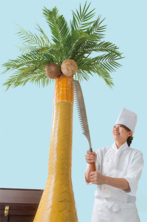 【特徴】高さ約2mのヤシの木の幹に見立てたアイスケーキを切り出すなどの楽しい演出でお届けします。アイスケーキの断面にもご注目ください。