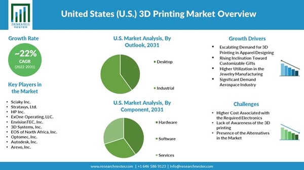 世界の米国(U.S.)の3Dプリンティング市場は、2022-2031年の予測期間中に22%のCAGRを獲得すると推定されています。