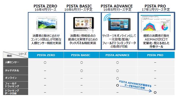 「PISTA2.0」シリーズとは、従来の店頭販促機能に加え、商品棚前における消費者滞留前後で流すコンテンツを切替える人感センサー機能を搭載したサイネージを「PISTA ZERO」、消費者の欲しい情報を見たいタイミングで選択させるタッチパネル機能を有するインタラクティブサイネージを「PISTA BASIC」、そして商品目前での消費者行動を捕捉・蓄積することによって、マーケティングに資するフィールド情報を提供するIoT型サイネージを「PISTA ADVANCE」という3つのラインナップで構成されております。