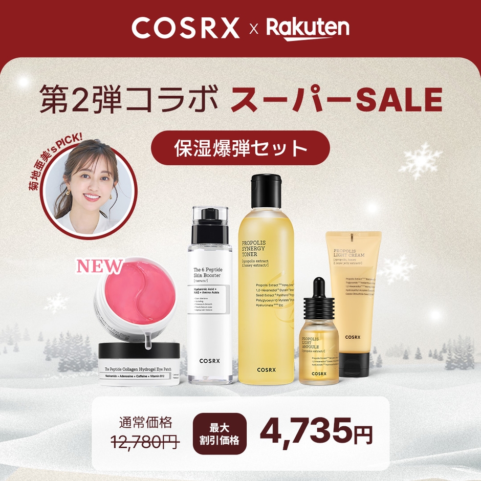 楽天市場のCOSRX公式ショップ限定で新商品「RXザ・ペプチドコラーゲンハイドロゲルアイパッチ」を販売いたします。本商品は菊地亜美さんが直接セレクトした乾燥する冬の保湿ケアのための製品のひとつで、菊池さんコラボの<保湿爆弾セット>をはじめ、<美白&ハリケアセット>、<肌荒れケアセット>の全てのセット構成に含まれています。
