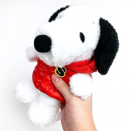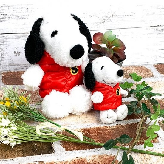 ある寒い日のスヌーピーが2サイズで登場。スヌーピーも冬支度♪真っ赤なダウンベストがオシャレなぬいぐるみ&マスコット