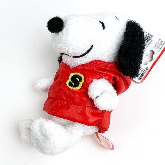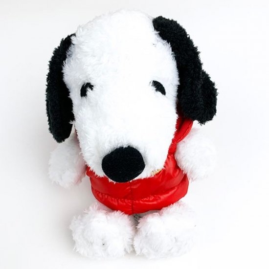 リアルなダウンジャケット姿の、スヌーピーのぬいぐるみです。スヌーピーって赤似合いますね!ドッグハウスも赤でしたし♪