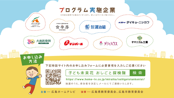 広島ホームテレビ(広島市中区)では小学校5・6年生を対象に、お仕事体験キャンペーンを行います。様々な企業での職業体験を通じてお子様たちの将来の夢や学びのきっかけづくりを応援します。