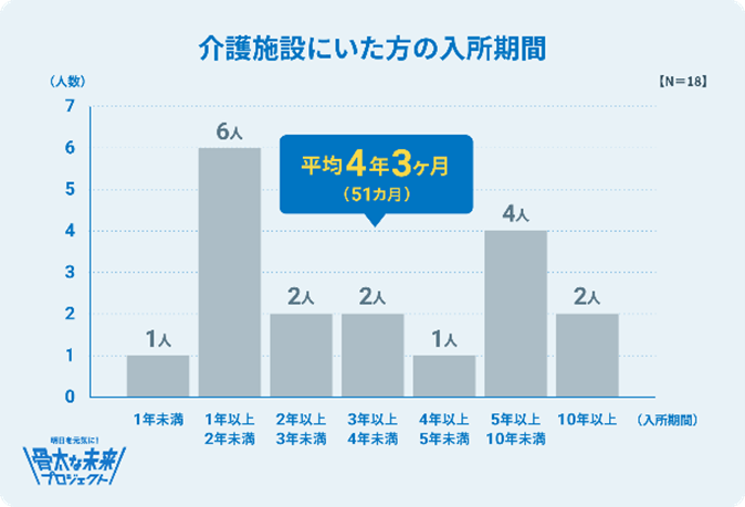 骨折により、やむを得ず介護施設に入所するケースがあります。今回の調査において、介護施設に入所した方の平均入所期間は51ヵ月(4年3ヵ月)であることがわかりました。