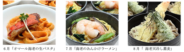 「イルマーレ」バイキング月替わりメニュー イメージ6月は「オマール海老の生パスタ」、7月は「海老のあんかけラーメン」、8月は「海老天冷し蕎麦」と、月替わりで異なるテイストの海老を和洋中人気の麺料理でお楽しみいただきます。