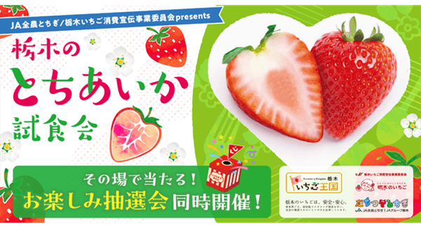 全国農業協同組合連合会栃木県本部(以下、JA全農とちぎ)は、栃木県内の「あしかがフラワーパーク」「東武ワールドスクウェア」「那須どうぶつ王国」にて、栃木県産のいちご“とちあいか”の試食会を実施いたします。
