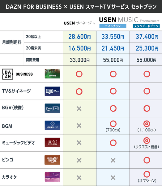 「DAZN FOR BUSINESS」の定価に実質1,100~2,750円追加するだけでテレビ本体をレンタルすることが可能です。「USEN MUSIC Entertainment ライトプラン」