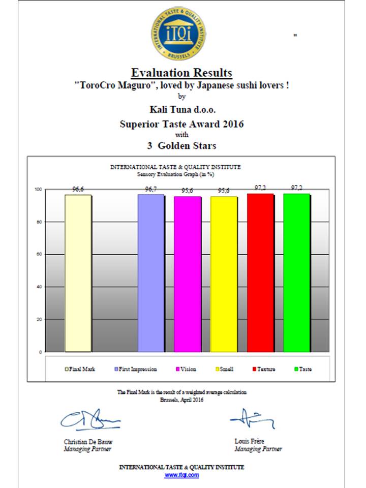株式会社ジェイトレーディング(所在地:東京都千代田区、代表取締役:神戸 治郎)は、世界中の味覚的に優れた食品および飲料品の審査・表彰・プロモーションを行う世界有数の独立機関「International Taste&Quality Institute-iTQi(国際味覚審査機構)( http://www.itqi.com/jp/ )」における2016年度の審査で、クロアチアのアドリア海沿岸で自然養殖されている『トロクロ まぐろ(c)』が総合点96.6%という高評価を受けたことを発表いたします。