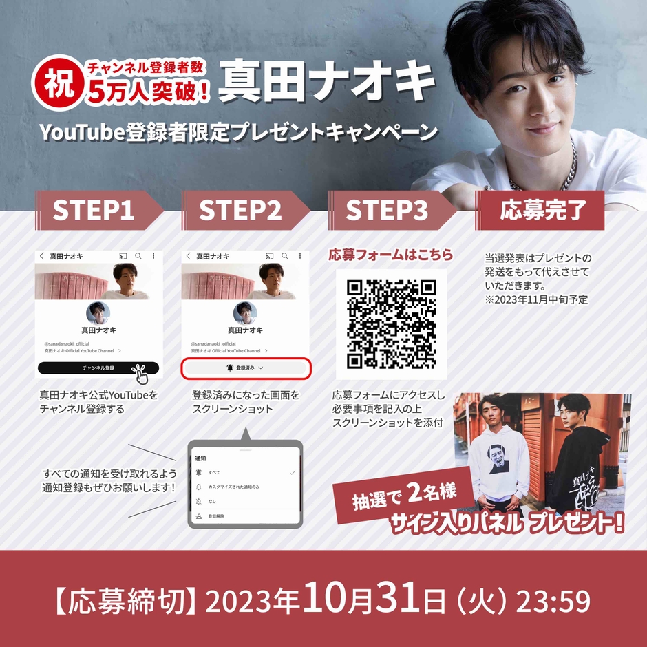 また、チャンネル登録者数5万人突破を記念して、期間中に真田ナオキ公式YouTubeをチャンネル登録の上、ご応募いただいた方の中から抽選で2名様にサイン入りパネル(A2サイズ)がプレゼントされる企画が本日からスタート。すでにご登録いただいている方、これから登録する方もどちらも応募ができる。応募締切りは、10月31日まで。