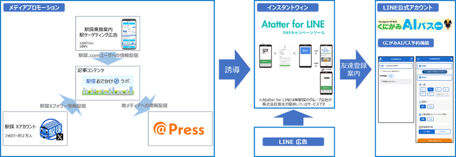 また、認知拡大・利用促進を推進すべく、駅探.comを軸としたプロモーション支援、および駅探のグループ会社である株式会社音生(本社:愛知県名古屋市、代表取締役:山田 文吾、以下「音生」)が提供するインスタントウィンサービス「Atatter for LINE」を活用したプロモーション活性化の推進事業を通じて本事業含めて地域創生に貢献していきます。