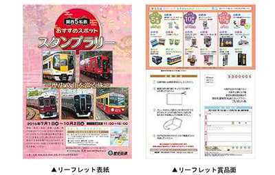 ・各社沿線に設置したスタンプラリーポイントで、専用台紙にスタンプを集め、スタンプ数により各コースに応募いただいた方を対象に、抽選で5私鉄沿線ゆかりの素敵な賞品15種類を総計200名にプレゼントします。