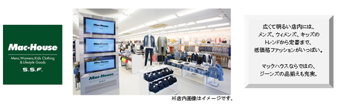 6月18日(土)『マックハウス スーパーストアフューチャー』山梨県富士吉田市に初進出「マックハウス スーパーストア フューチャー」は、プライベートブランドを中心に、カジュアルウェアからビジカジ、ハイセンスなトレンドファッションから、実用衣料のインナーレッグウェアや雑貨まで、幅広い品揃えで展開する新コンセプト・カジュアルショップです。