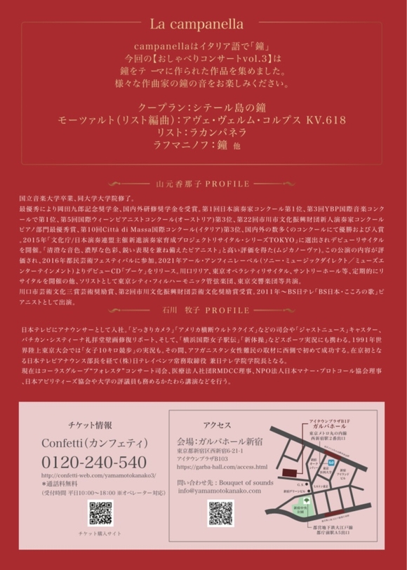 『ピアニスト山元香那子とアナウンサー石川牧子のおしゃべりコンサートvol.3』が2023年11月10日(金)にガルバホール(東京都新宿区西新宿6丁目21-1 アイタウンプラザ B-103)にて開催されます。