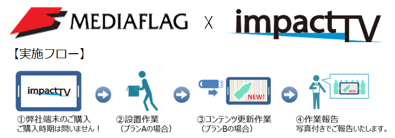 店頭用デジタルサイネージを取り扱う株式会社impactTVは、フィールドマーケティングを展開する株式会社メディアフラッグの店舗巡回サービスを提供するキャンペーンを実施いたします。サイネージの運用をサポートするラウンダー派遣(店舗巡回)をお手頃価格でご提供いたします。弊社の製品(サイネージ機器)の設置または既に設置済みの弊社端末で再生するコンテンツの更新作業を行い、さらに作業内容を写真付きのレポート形式でご報告いたします。全国のエリアを対象に低コストで売り場作りをサポートいたします。